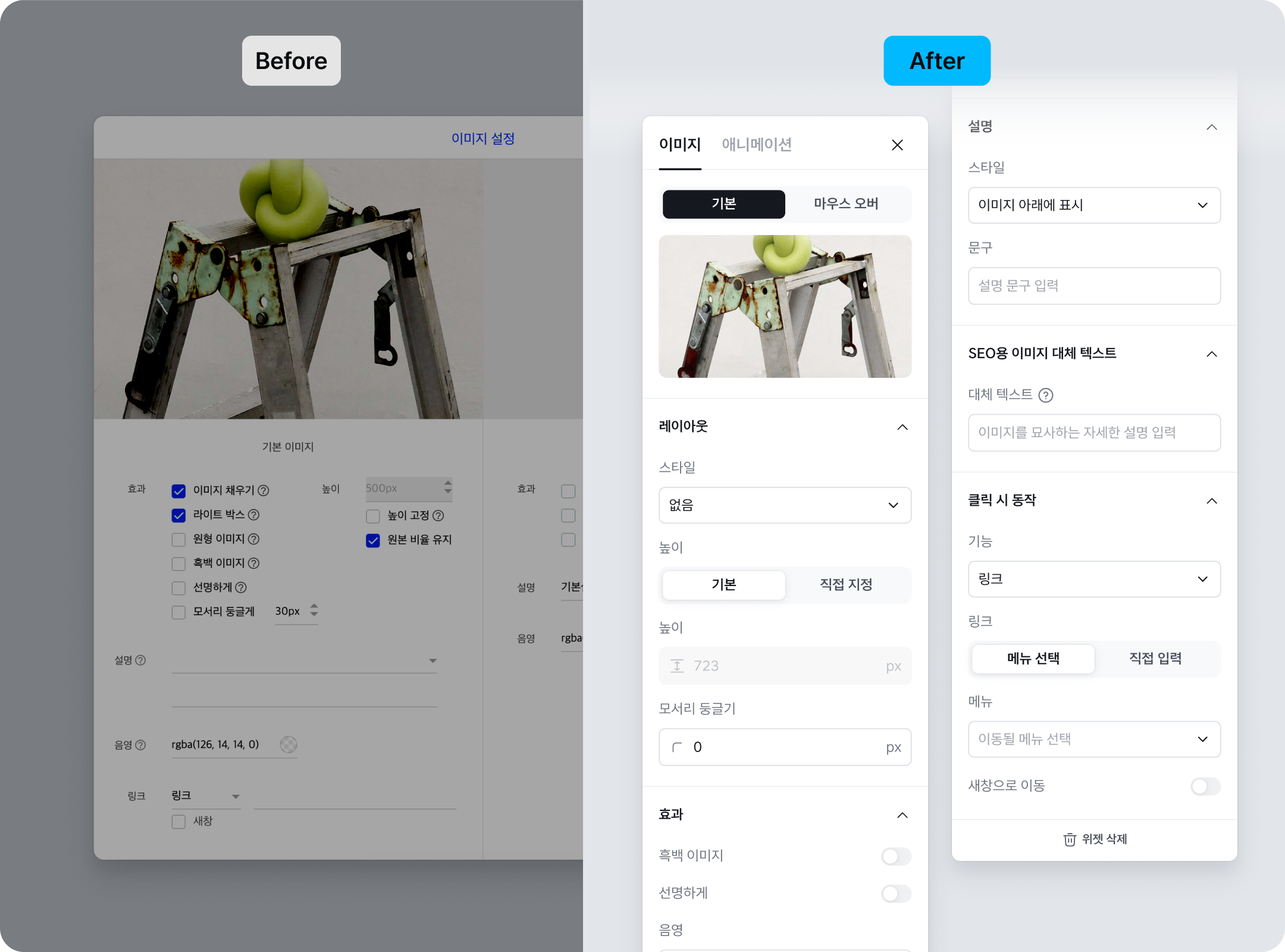 이제 디자인 모드에서 위젯을 클릭하면 화면 한 가운데를 덮던 설정 패널(모달 창) 대신, 화면 우측에 슬림하게 밀착되는 사이드패널이 나타납니다. 패널에서 값을 바꾸는 즉시, 좌측 화면에서 사이트 디자인이 어떻게 변하는지 바로 확인할 수 있죠. 전문 디자인 툴을 쓰는 것처럼 매끄러운 작업이 가능해요.